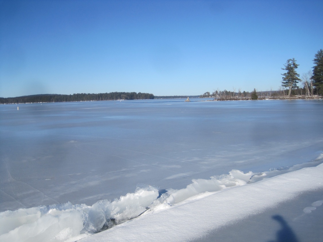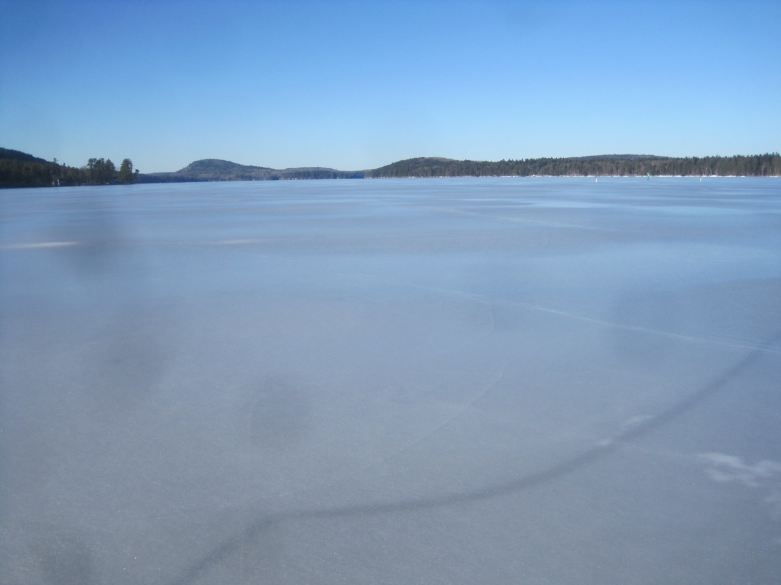 Belgrade Lakes is just far enough from the coast to keep their ice, yet close enough to wet out nicely. Chickawaukee is all open, Damariscotta is right behind. Jory and I skate sailed from the public boat launch on Great Pond out to the bottom of Hoyt Island. The straight there, which leads to the larger east side of the lake, is open. Looking east we could see nothing out of order. The west side north from the launch looks fine, except for this ridge. We chopped down 8″ finding no water; local reports are telling us 11″.