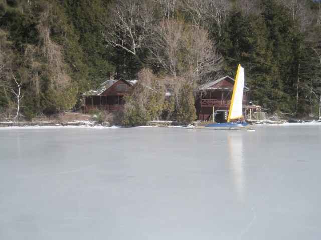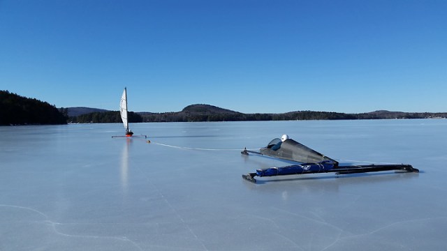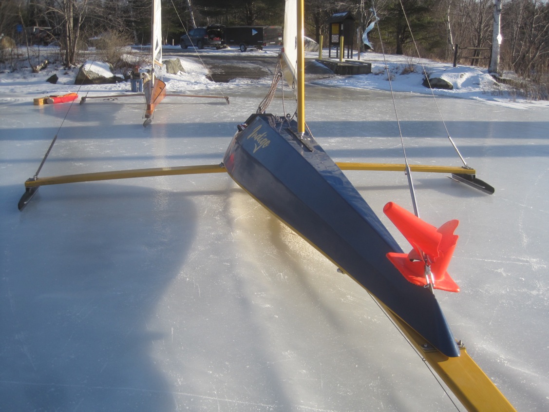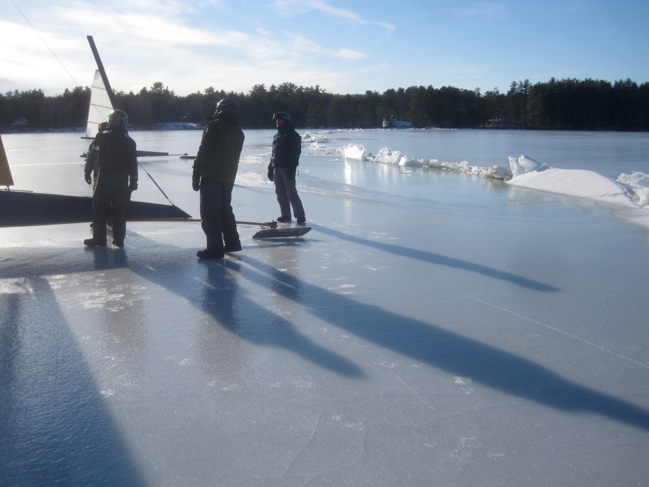 One of the great joys of a fabulous day on the ice is meeting new people and being a part of such perma-grin joy. Yesterday, life was such an easy game to play. Wind, sun, ice and all on a Saturday. Carl Jelleme, Chris Gordon and his gang on safari from Nantucket hit the jackpot. Tom Nichols had his new boat out for the first time this year and was really getting it dialed in, leaving the fleet behind when his mast broke (of course there wasn’t a full rigged Whizz on hand to give him some real competition, but Indigo came close) It was an old A Cat mast that just wasn’t up to the task. Dave Fortier towed him home from the backside of Hoyt Island.