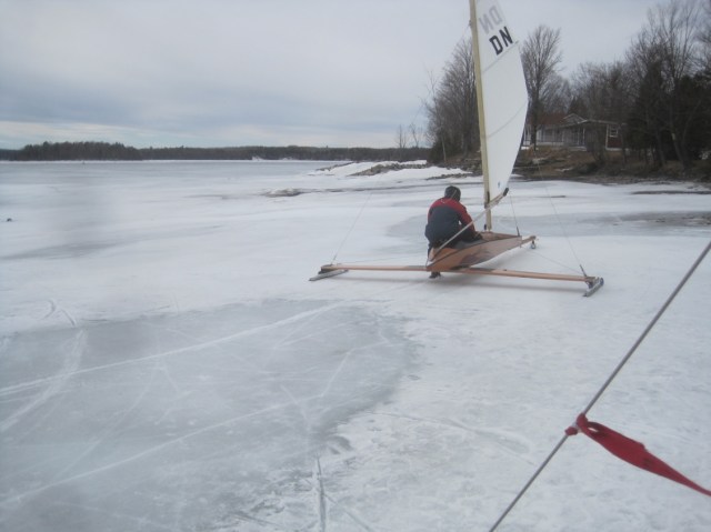 Lac St. Francois, Quebec. Deep slush Friday, mid twenties Friday night and hard ice Saturday until about noon. It became half hard, half slush for the rest of the day so when the boat was slammed by a gust in the slush it hit the hard stuff in a full slide. Great fun! Temps last night were at freezing, just. But by this morning the ice was black, hard and drain holes frozen. This never ceases to amaze but it happens all the time; don’t forget. The wind had settled a bit and shifted to right down the middle, so Denis and I swapped tacks up and gybes down in full spring sun.