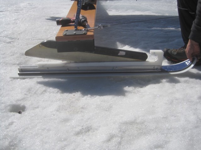 The second one is Skunners. Denis has made a swell set. I was on conventional slush runners and after many miles of research, neither one seemed to offer an advantage on the 50/50 mix of yesterday’s surface. There is a 1/4″ of blade protruding below the ski, but we think 1/2″ might be just about right for general slush conditions. The running surface is HDPE plastic, which is very slippery when wet. The base of the old alpine skiis might be just as good, though.