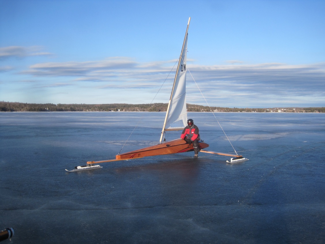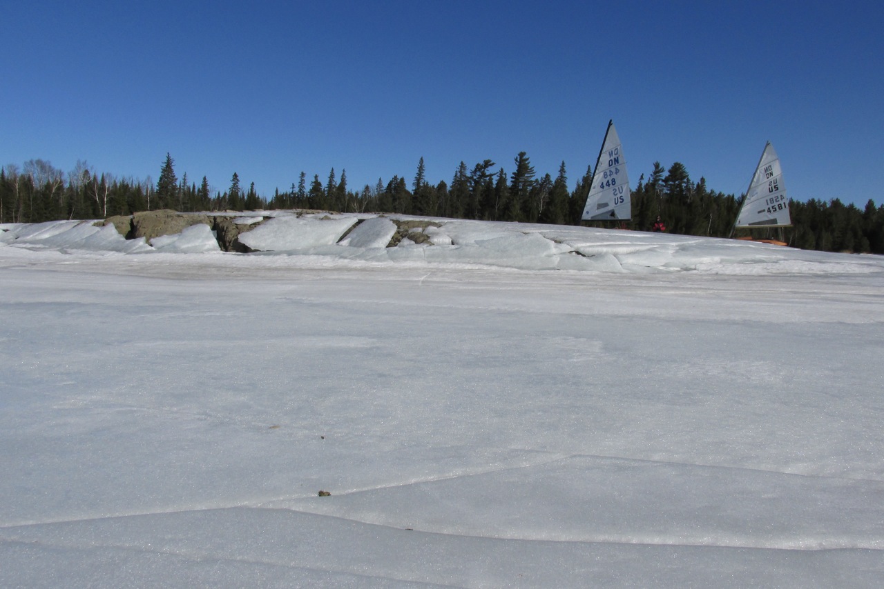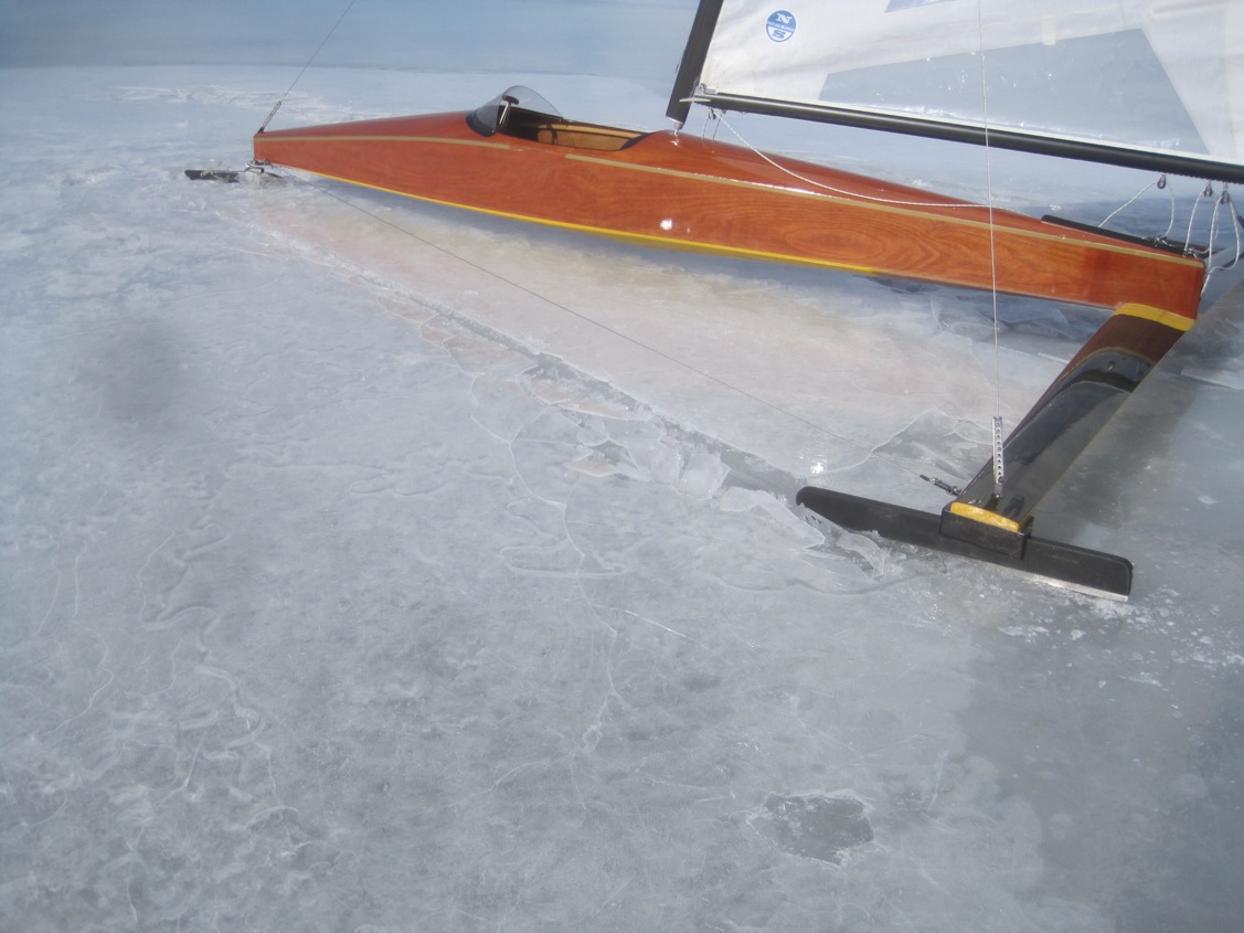 Lac St. Francois, Quebec. Deep slush Friday, mid twenties Friday night and hard ice Saturday until about noon. It became half hard, half slush for the rest of the day so when the boat was slammed by a gust in the slush it hit the hard stuff in a full slide. Great fun! Temps last night were at freezing, just. But by this morning the ice was black, hard and drain holes frozen. This never ceases to amaze but it happens all the time; don’t forget. The wind had settled a bit and shifted to right down the middle, so Denis and I swapped tacks up and gybes down in full spring sun.