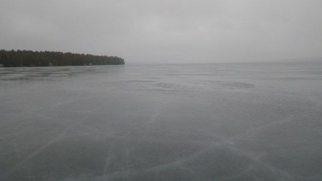 “We went out on the ice at 1pm and got off at 3:30. The only soft spots were the white or remains of the white areas. Out in the very middle of the south end there is a very smooth area [acres large] but we checked it and it is a little thinner (8″)and it was not as hard as most other areas. That area was very flat and smooth and had water sitting on it from the rain. We expect that spot to get hard and safer over the weekends predicted cold temps at night. The most consistent ice was in the north end which we did not get to today, but yesterday it was almost down to its hard ice and then had a prickly surface. That is probably much smoother today. North end is quite big if you start at Knights landing on Brownville side and head north [look at map of lake]. You will need a plank there. There were no pressure ridges from Knights up to north end yesterday and a few down south. Best to go to Knights landing. You turn right off of 11 in Brownville at 4 corners and swing to the left after crossing bridge and look for turn to the lake. When you get to the end or T take right and look for the landing. You will have to park along side the road which should be easy [very little camp traffic]. Knights Landing will look like a closed down store, landing across street.