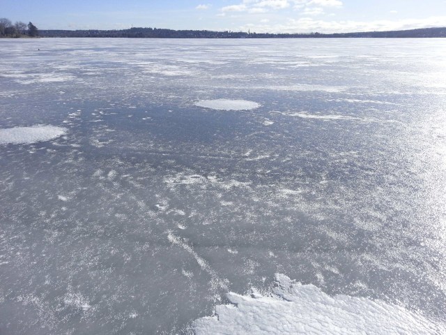 Finely textured ice, no bumps, no snow, except some patches of less than half an inch hard frozen snow. Ice surface is very hard. The fishermen’s holes (6 inches diameter) have healed and the ice in the holes froze to more than 6 inches.