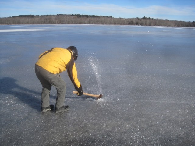 We scouted the pond abut half way across and all the way down to the marshes along the road side and found a consistent 3″ of grey ice. The few patches of thick snow sheltered thinner ice, but there are not many of these and are easy to avoid. The hard frozen snow is fine, as is the thin un-bonded stuff.