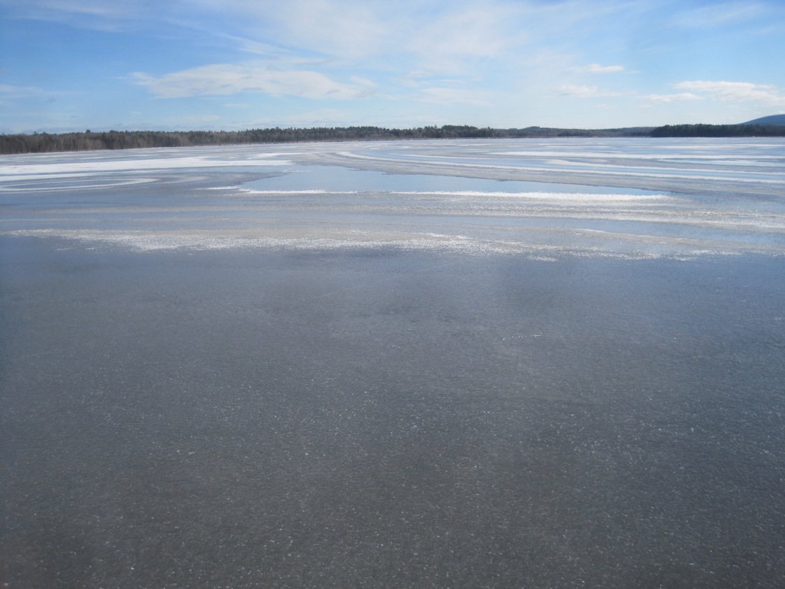 This certainly looks less than appealing, but Dave Fortier has offered to lead us right down the middle. The glossy spots are 2″ of new black ice. The rest of the frozen stuff is fine. The snow in the left background should be avoided. Temps in the teens tonight might bring us another inch.
