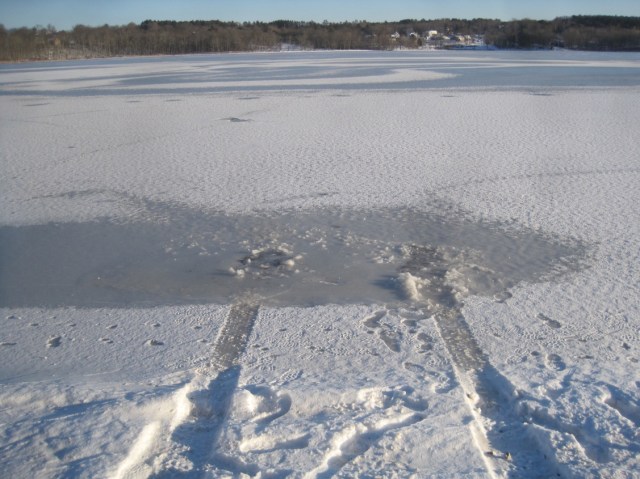 It was very cold and windy here today, so this fellow decided to do a modified drive-by ice check:
