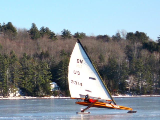 The ice is just as nice as it looks, but snow is due tomorrow. We’re hoping for rain on the coast as Chickie and Megunticook are ready to sail now, right after that jolly guy bearing gifts finishes his rounds. Lloyd and Jory sailed Megunticook after skating Chickie and report ice almost as nice as this. Thanks to Fortier, Raymond, Guertin, Rindlaub, MacEwen, Bunting, Gagnon skating (he’s fine after his crash yesterday), his pal Jimi, John, all the others I’m forgetting for taking a chance on the forecast and showing up! Stand by for next time.