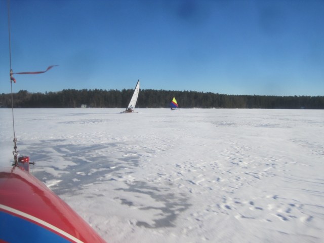 “Ten boats sailed a nice 20kt NW breeze today from Leavitts Beach. Lots of drag racing! A number of boats still on the ice hoping to sail Monday’s SW wind. Many big smiles today.”