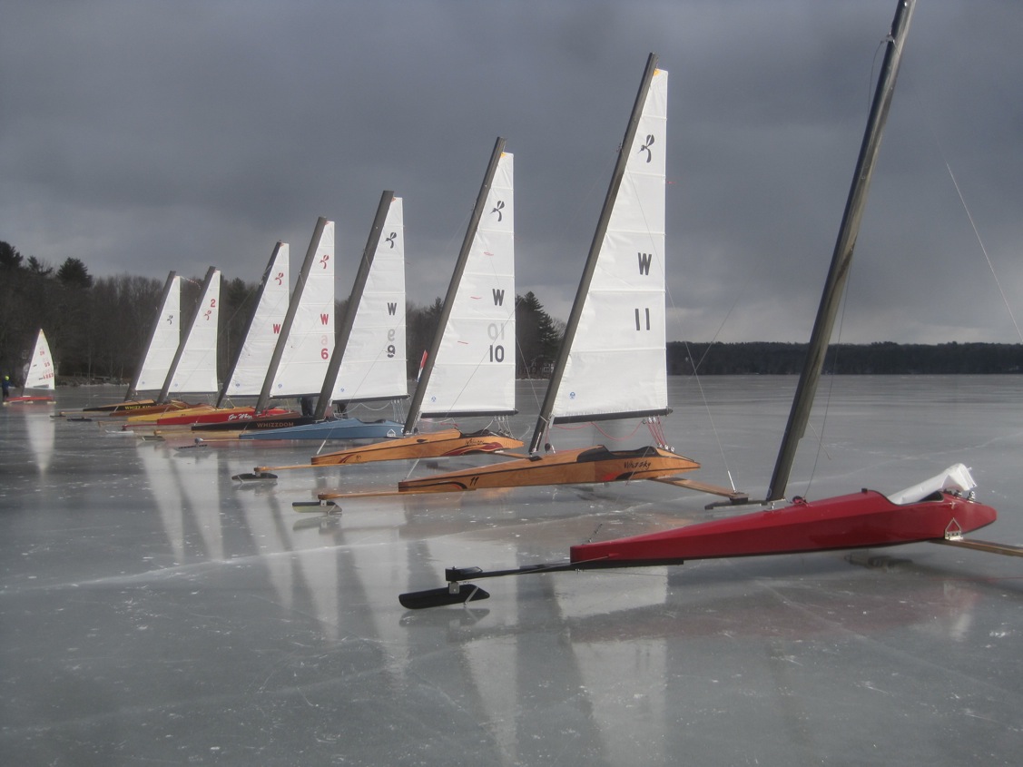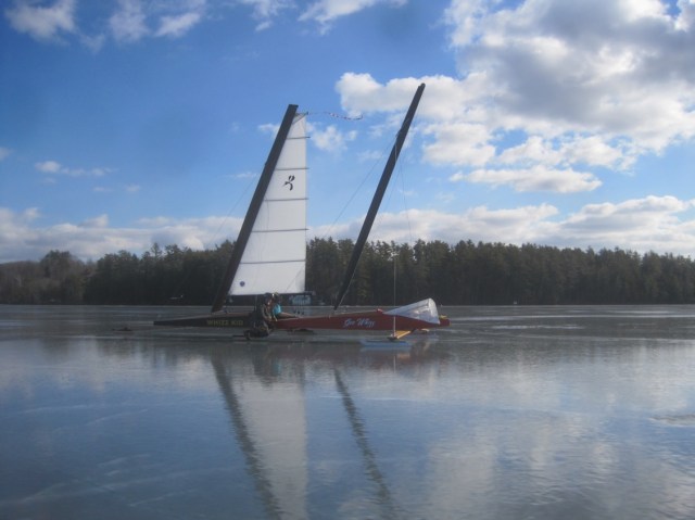 As Steve Lamb said, while he and James packed their trailer in the very last seconds of daylight, “you could write a book about today. Where you gonna start?” Well, in true Lamb fashion I’ll start with a drink, and not the kind that two sailors today found themselves in. They said the sun was in their eyes, but it was probably more like ice narcosis. Jim Gagnon counted thirty-eight boats around lunch time, and he said that when you include the two Lockly Skimmers that’s forty. Not since Winnepesaukee 2010, correct me if I’m wrong, have we had such a fantastic turnout of iceboats. How could we not be blinded by the light?