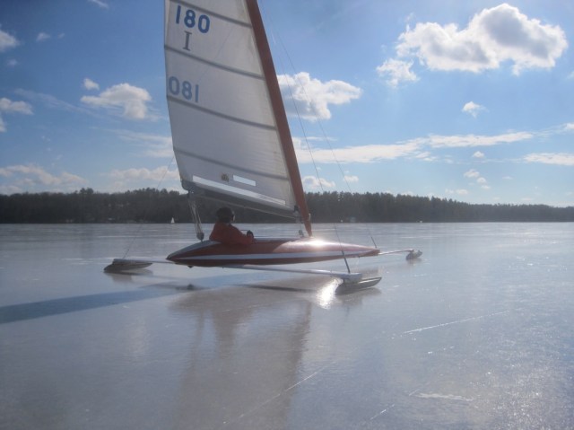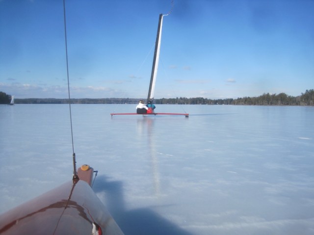 The quality of the ice in the South Broads continues to prove the old ax that the ice is always better on the other side of the narrows/pressure ridge/whathaveyou. Good chance of snow on Wednesday, with little hope of recovery. If this is it, it has indeed been the best and longest run of excellent conditions on Damariscotta Lake in recent iceboating history. We were blessed to be a part of it, and not stuck in a departure lounge somewhere being indefinitely detained by a demented dictator.