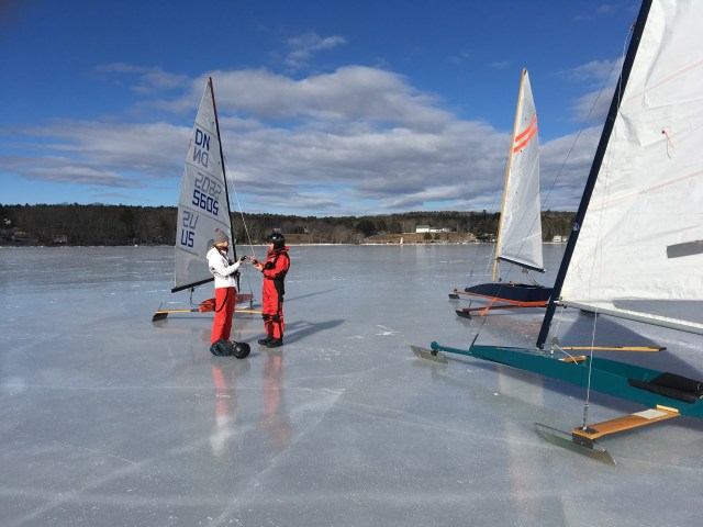 “15 + or – boats were sailing at times; the winds were light and shifty. We had a good time with the reporters from the BDN. The were very interested and asked lots of great questions. As the winds were light there were not a lot of great photo ops, but they did get some shots of all us as posers. They spoke with almost everyone there then headed out on to the ice. Bill Bunting attempted to give one a ride but the wind just did not cooperate. The photographer, who was on skates, entertained Bill and I with a little ice dancing. See video sent separately.”