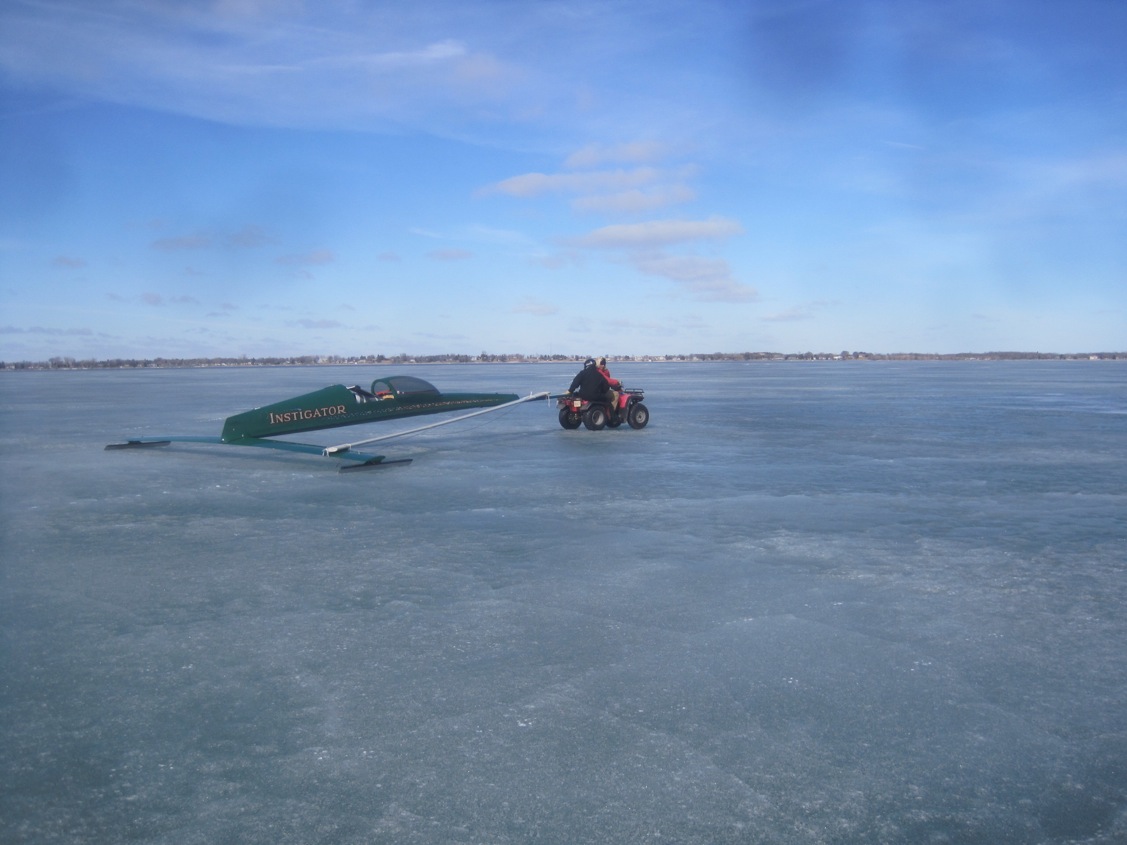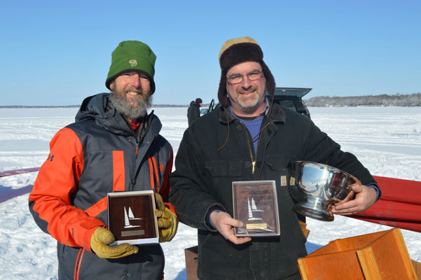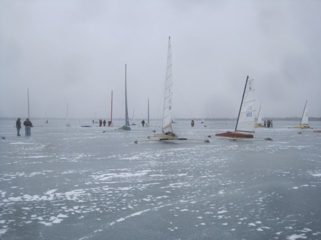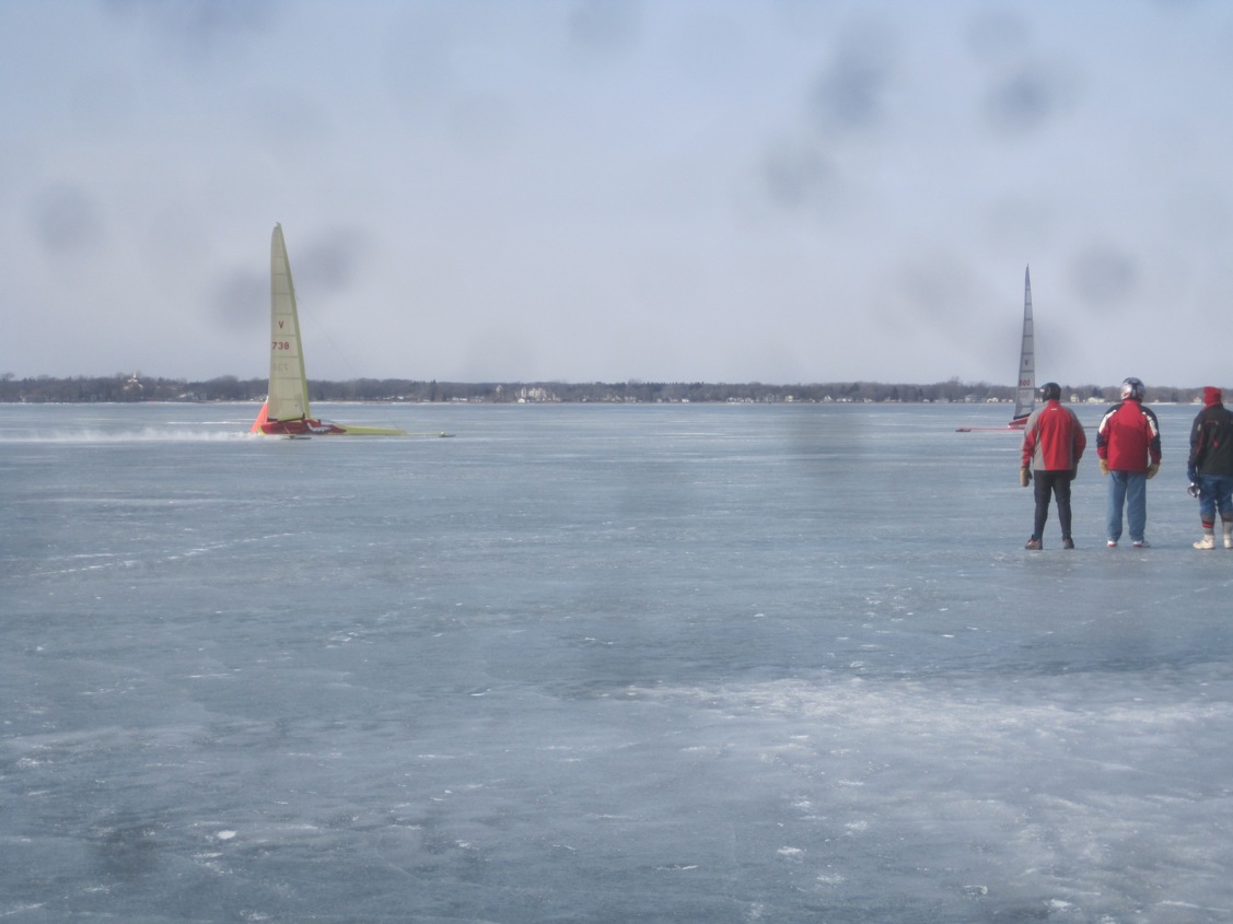 The snow that shut down the racing on Saturday persisted into the evening. Three boats got trapped by the falling wind, sticky ice and poor visibility. Without the wind, you had no directional reference. There was a small shift which sent one Renegade to the wrong end of the lake. But he went ashore, noted his location on his phone, knocked on a friendly door and was given a ride back to the pits. It was dark by now, but they found the boat by car and towed him the four miles back. Same with the others. All in all, just another great day on the ice.