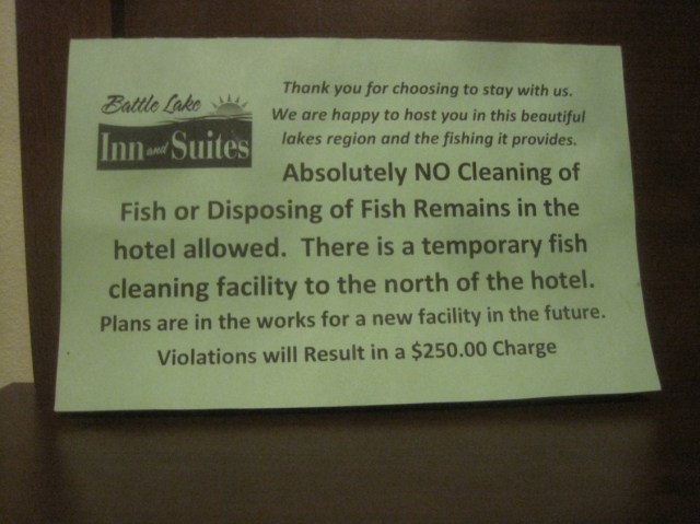 As we all know, traveling is one of the fringe benefits of this lunatic fringe sport. For those who are fans of Garrison Keilor, Battle Lake could be the setting for his fictional town of Lake Woebegon. The Shoreline was easily the Chatterbox Cafe; one morning we sat with three local guys for breakfast. They had the accents, and that slow careful declaration of everyday news. This sign in the hotel room offers a cultural indicator: