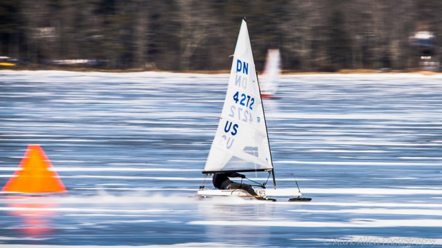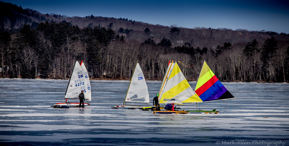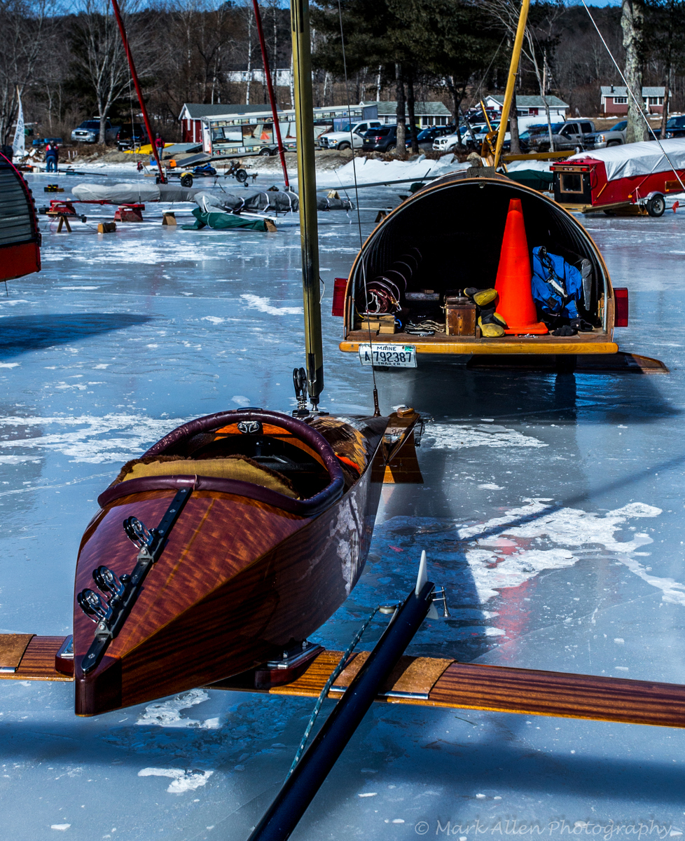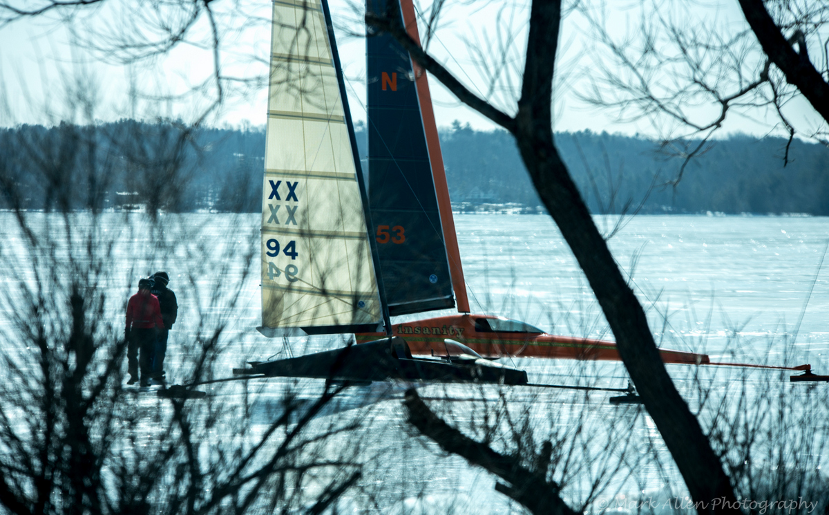 For many people, this was to be the last day of the season. Southern lakes are done and the entire east coast is about to be hammered by a massive blizzard. By the time all that snow melts there will be crocuses peeking out of the melt pools and even our ice could be mush. We will, of course, continue to scour the big inland lakes for a good surface with enough ice under it. But Damariscotta Lake probably won’t survive. What an elegant and generous lake she’s been this winter. And after all she’s been through in these past weeks, to have the fortitude to get us yet one more session with wind and sun is way beyond what even the most optimistic iceboater could expect. And on a weekend! We wish her the best this coming off-season.