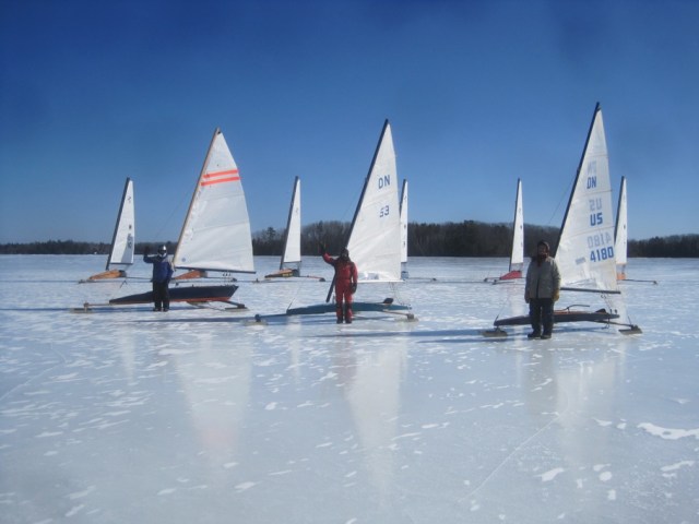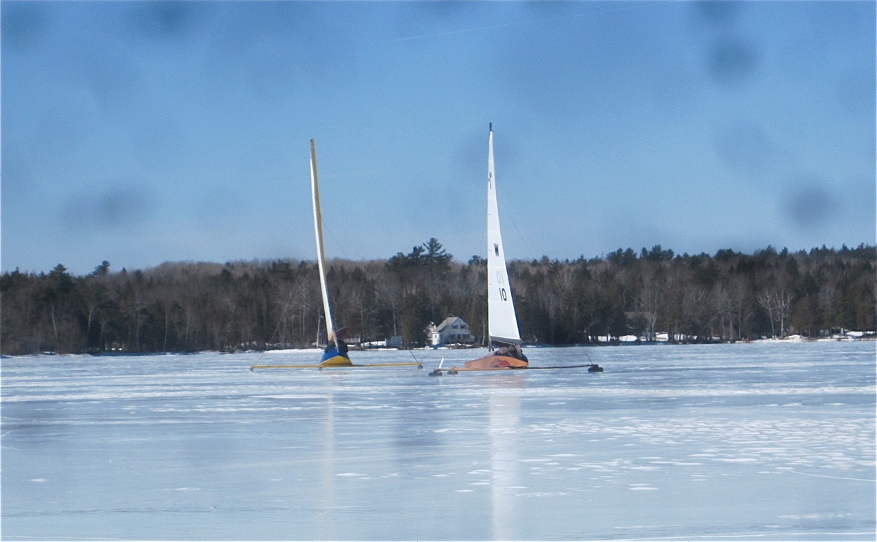 Monday was a bonus day all around, payoff for the thrilling terror of the ice cold high wind weekend. When your correspondent first pushed off on the lovely grade 8 ice of Pushaw, it was really enough just to cleat the sheet on a close reach, and poke along at a slow jog. But once the others came out, it was back to the sheet and a long race to windward and the north end of the lake. Pushaw is oriented NW-SE, so it’s an ideal up-wind downwind lake for the usual winter wind. It will be a great venue for Whizz Regatta 2018. We had a warm-up heat just to be sure:
