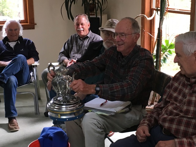 Bill Bunting presented the Cheapskate trophy he built to the Commodore of the Cheapskate Fleet, Lloyd Roberts. Thanks to Patsy for the awesome polishing job. She even left the polishing cloths in the cup for the next winner. Kate Morrone photo.
