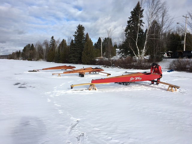 Even with snow in the overnight forecast, Jim and I decided to head to Canada anyway. The reports of five inches of nicely surfaced ice was too good to pass up. And the wind was supposed to be strong SW, blowing right up the middle of Lac Abenakis, the “big” lake in the village of Ste. Aurelie. A big surprise on the ride through Jackman was the view of Wood and Attean Ponds completely frozen and snow free. A drive by inspection from the center of town confirmed a plate of nice grey ice. We might have missed that one. Of course it was snowing by then and we had a hot date across the border so didn’t stop to inspect. The border was bleak, as usual, with blowing snow and grey bunkers.