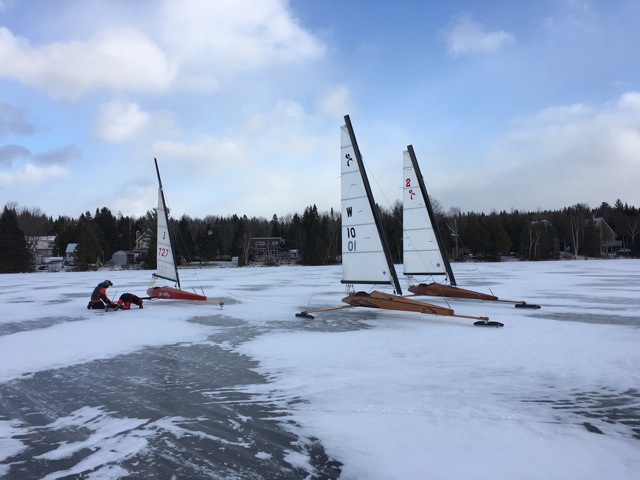 The access was carry on, but the Whizz is an easy lug for two guys. Jim was taking his new boat for its maiden sail. Soon Jacques Charbineau and Claude Morin showed up and, as DN guys will do, immediately set up marks. Jim was starting out slowly with a storm sail, but Whizzard and Whizzper duked it out neck and neck for a couple of dozen laps. It’s remarkable how competitive these boats are; we were side by side at nearly every mark rounding, over and over. We finally had to quit out of sheer exhaustion, so eased sheets and jogged quietly along the shoreline, admiring the creativity people put into their summer cabins, all gingerbread and curlycues.