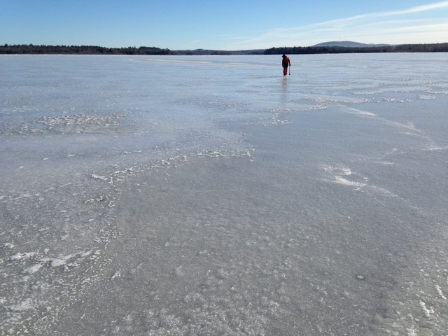 Entire plate has over four inches; the rose colored glasses have been removed and the grade has been reduced to four. We skated most of it and it was ok, sailing was fine. The wind held nicely until dusk. There is some slushy bits and some shell ice near the pit area, but nothing to worry about in the main body.