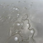 Chickawaukee after 3 days of 40-50 F and 2 inches of rain and run off from 15 inches of melted snow is down to foundation black ice 5-8 inches thick (was 8-10) with peculiar “herd of deer tracks” surface, depressions 2-6 inches across and 1/4-3/4 inches deep with intervening lovely flat very fast looking black ice. It looks like a fast very rattly ride, likely not enjoyable but sailable, not skatable. Overall grade 4 perhaps. The water level is up 10 inches with board access at Lloyd’s and Town beach at SW corner off Rte 17. My lawn is soft, will harden overnight, Town parking lot is muddy, will harden. Each “deer” print has a small to teeny drain hole, some with a strange white circle around them down in the ice, like deer eyes. We could be the next “buck eye state”.