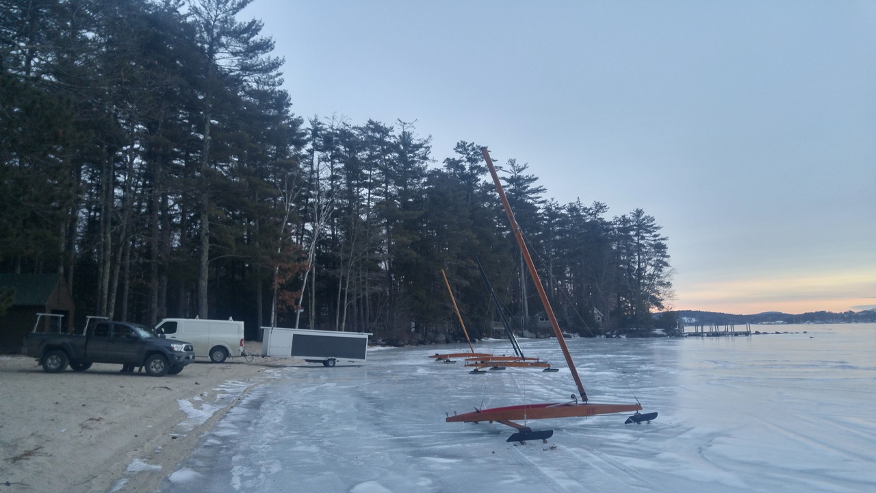 “There were 7 or 8 boats at a lovely private beach club out on Meredith Neck yesterday. Four boats made a fast trek halfway down the lake with the usual social stops in the lee of lovely islands. It was that go-fast go-far no worries kind of sailing. The lake is unusually monolithic this year. The shorelines are very stable. There was little transition from beach to lake; not even a bump. Few pressure ridges, very very few open spots, smooth thick ice. A paradise. We sailed in Meredith Bay until the wind died at sunset. 4 boats were left in the ice: local guys with a great sense of ice optimism as snow is in the forecast. I believe there will be much more sailing.”