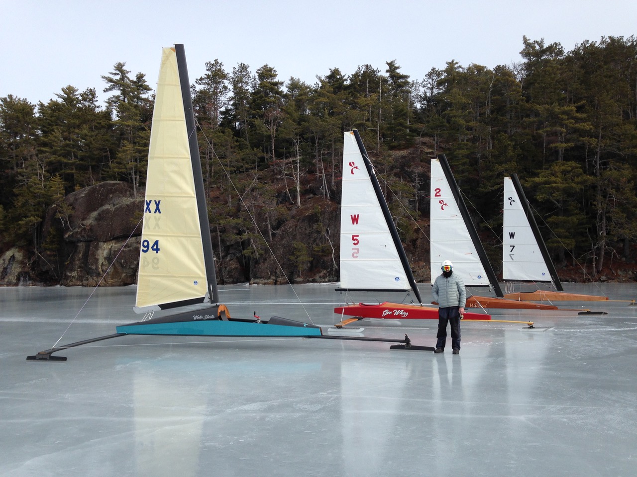 In addition to these guys, Bryce was sailing his new Blade Runner, Paul with Icywood, Ben gracing the piney shoreline with the gaff rigged Tipsy, and Bob with his Cheapskate. See the ice? It was that good!