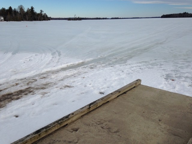 The launch is in excellent shape, and the smooth white surface extends to the horizon. Sadly, only the top layer of slush has frozen. The head of the ax returned a deep hollow sound. Under the frozen top there’s still six inches of water.