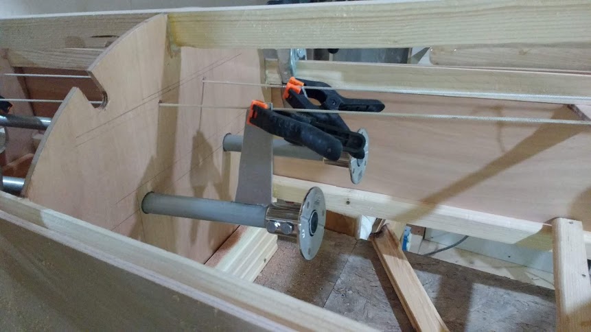 The flange bases will get wood pads and the 1/8″ plate will connect to the steering cables with small cable clamps. A chain saw file makes a nice groove in the top edge of that plate for the cable to rest in. You don’t want to make these wood foot pedal pads too large because sometimes you want to scoot your feet down behind the pedals right to the bulkhead, like when you’re on a long, cold, windy run so your head is a low as possible to reduce wind chill and windage. It also helps if you’re trying to keep the other guy from passing you. In that position the wheel is in just the right place for steering, the sheet is cleated, you’re out of the wind and life is good.