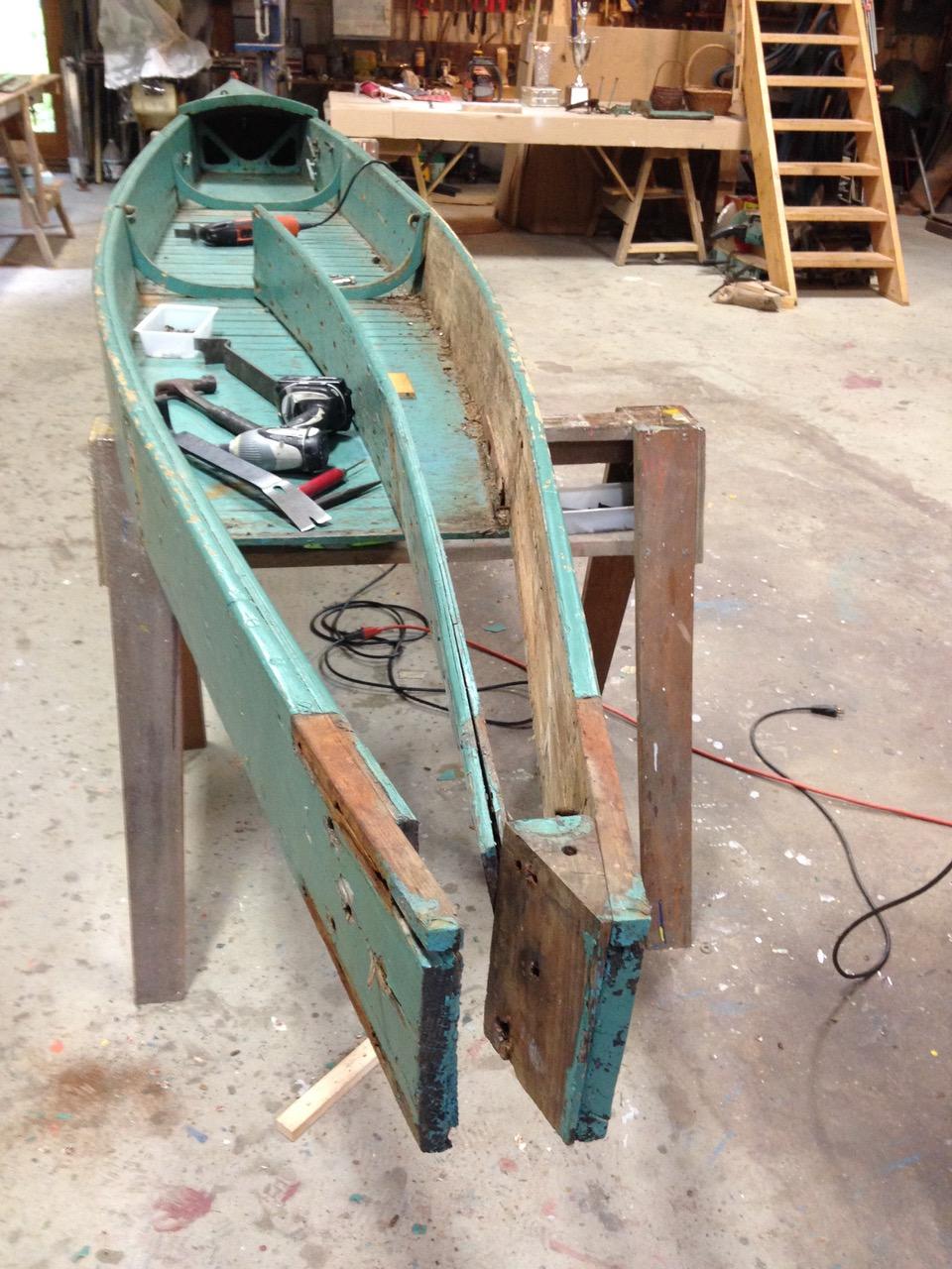 Curiously, the full length side boards are backed up on the inside with plywood. It’s obviously original, fastened with copper rivets and hide glue. It was delaminating, as seventy-five year old plywood tends to do. There’s rusty steel, broken screws, all the special treats found in old boats. As soon as the steel breasthooks were removed from the stern, she just fell open. Amazing how old boats, both soft and hard, can hold together mostly by habit.