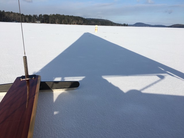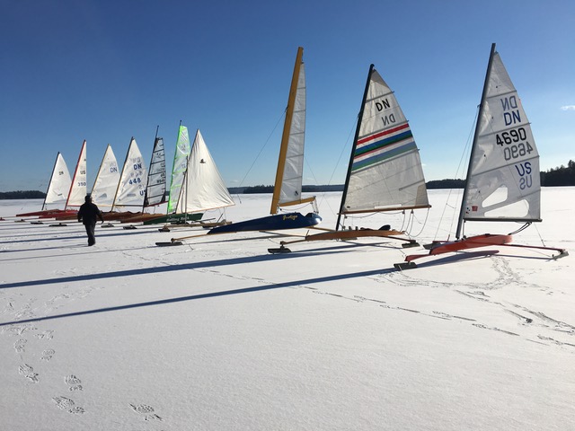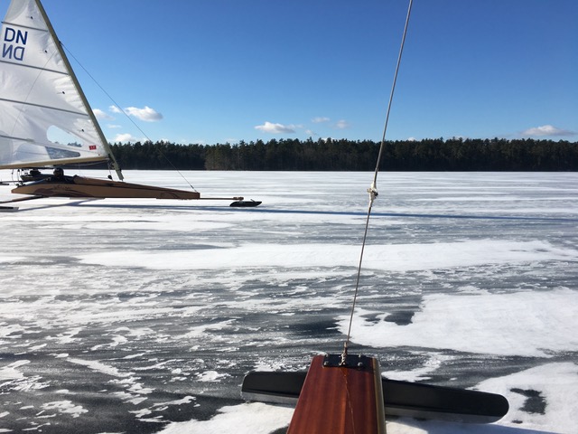 The only thing I can say about yesterday is to repeat what everyone else told me over and over: that this was the best day ever, Hands Down. Amazing ice, excellent wind, the drama of blowing snow yet agin revealing the splendor beneath. It’s nice to pull up to a lake and see miles of black ice. Well, perhaps more than just nice, but when it’s covered in a thin negligee which the wind slowly removes and the secret skin revealed one patch at a time, all while flying up and down the lake with a tight group of good sailors…