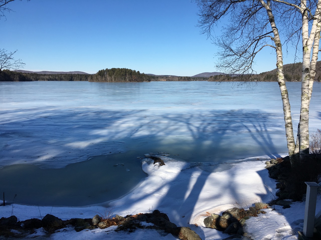 The couple of inches of rain yesterday more than wetted out the lakes. The runoff has left wide moats around access spots at Megunticook and Damariscotta. Temps tonight are unlikely to freeze them. The ice on both Dammy and Megunticook looks nice: