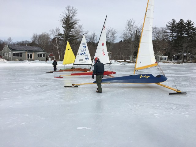 We made the pilgrimage to our old launch at Damariscotta Lake Farm. The ice heaving up along the shore would have required chain saws and axes to get access, so we all agreed that the Vannah Rd launch is very satisfactory. Out of the photo, stalled, is Paul Tropea from New York City. He drove up late yesterday for his first sail of the season. Way to go, Paul!