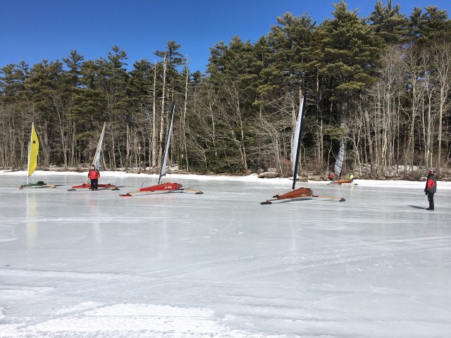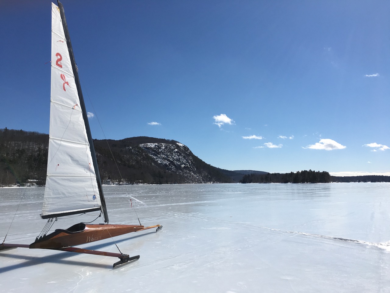 The predicted SW wind filled in early on Lake Megunticook today, and six iceboats showed up to sail on this, the last day, we thought, before major snow. The track and timing of the storm has been shifting. But today was full sun spring sailing with the warm SW wind twisting and swirling its way through the nooks and crannies of the lake. It was intimate sailing at its best. Chasing the shifts and puffs along shore, deep in a cove, getting wound up on that nice smooth patch next to the dock or between those two rocks. Then back out to the broads where the big wind blew, usually 8-10 with gusts.