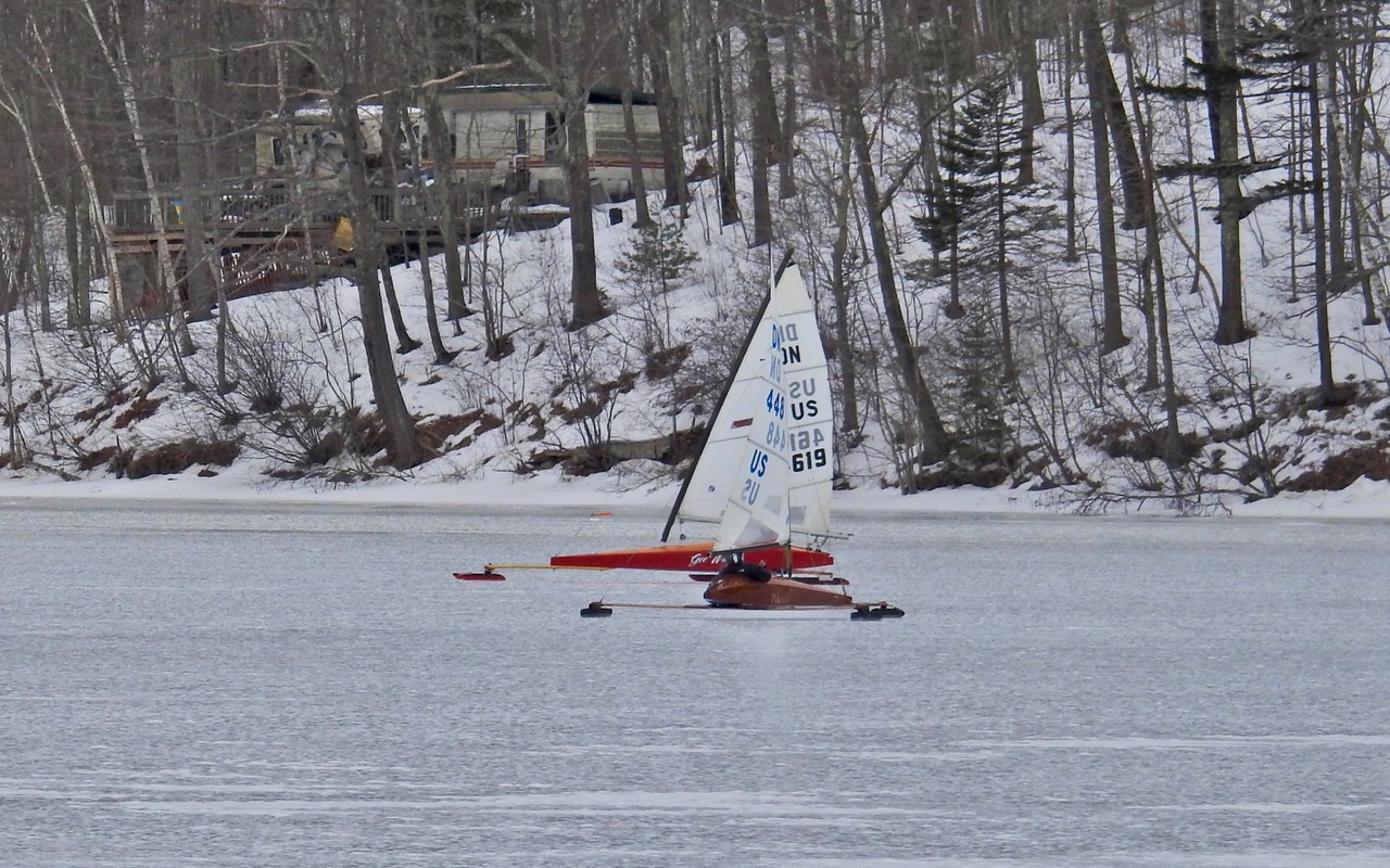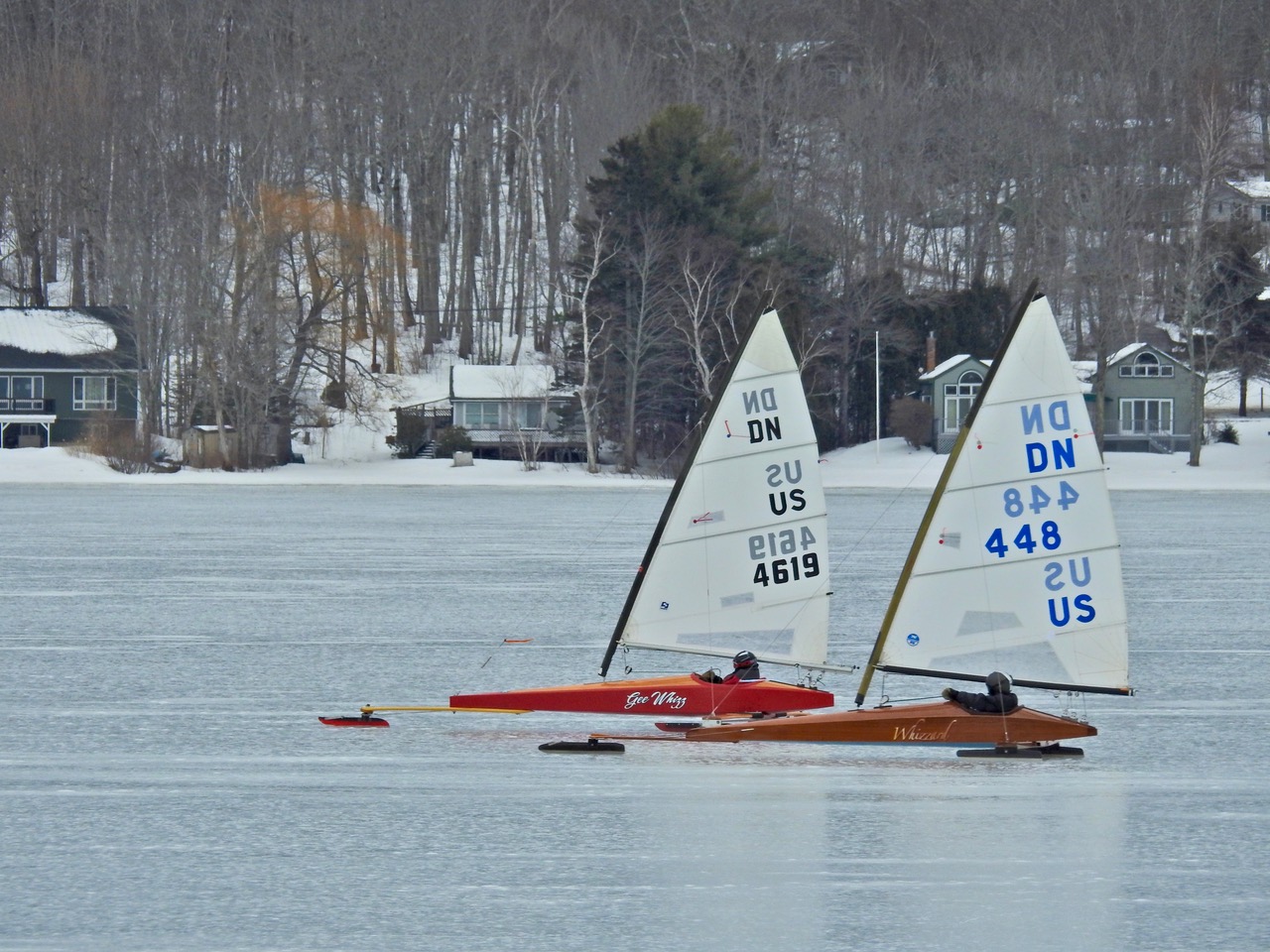 The snow held off until mid afternoon, and then it was only a dusting. The ice on Chickie was the best of the three lakes in good shape, but as it lacks touring possibilities so we set up marks and did laps. T and Karin came up from Newport, Bunting joined in as did newbie Mike James in a classic DN. We had lunch at Lloyd’s beach in the lee of the brisk northeaster.