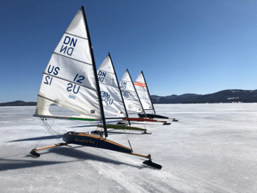 If I remember correctly it was right around noon when we left Center Harbor, the wind was still strong, and so the fleet did not head to Wolfeboro direct, but covered many miles in the bay going very fast on reaches as cruisers do. As time passed the fleet then crossed the ridge with the cairn marking the crossing. We then sailed on that piece of ice for a while, carefully crossed the next ridge.