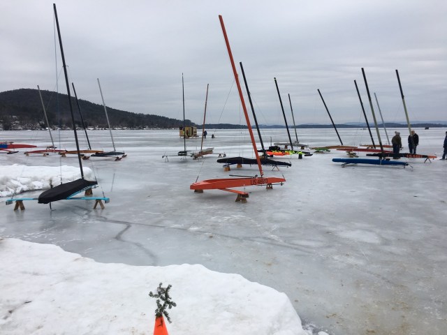 About thirty boats showed up for the New England Championships. As it was Ground Hog Day weekend it was appropriate that Saturday was a repeat of a couple of days last week at the North Americans: push and glide, chat with friends, nap in the boat. There was a bit of a puff early, but getting back downwind to the pits was a challenge; certainly impossible for racing.