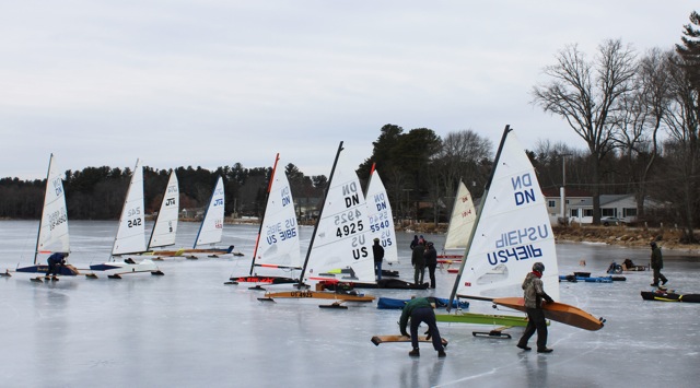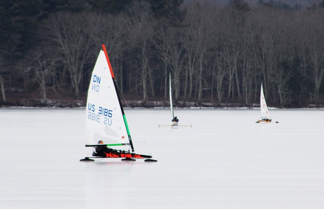 In honor of the holiday and past presidents, the NEIYA inaugurated The Presidents Day Cup and held it at Quabog Pond today. The hard core of eastern DN racing showed up, with a few notable exceptions, and seven races were run. Secretary Karen Binder did an excellent job of organizing and running the event. There were a handful of cruisers as well, who took their laps while the DN fleet rested between races. It’s a wonderful thing to be able to share such a small plate of ice with both groups. Happily, this is usually how it works out.