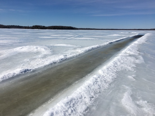 This is the remnants of a plowed path from the shore it a fish house. It is near the shore at the windward mark but easily visable. There is a green flag at the end of it. If you run over it you’ll get wet.
