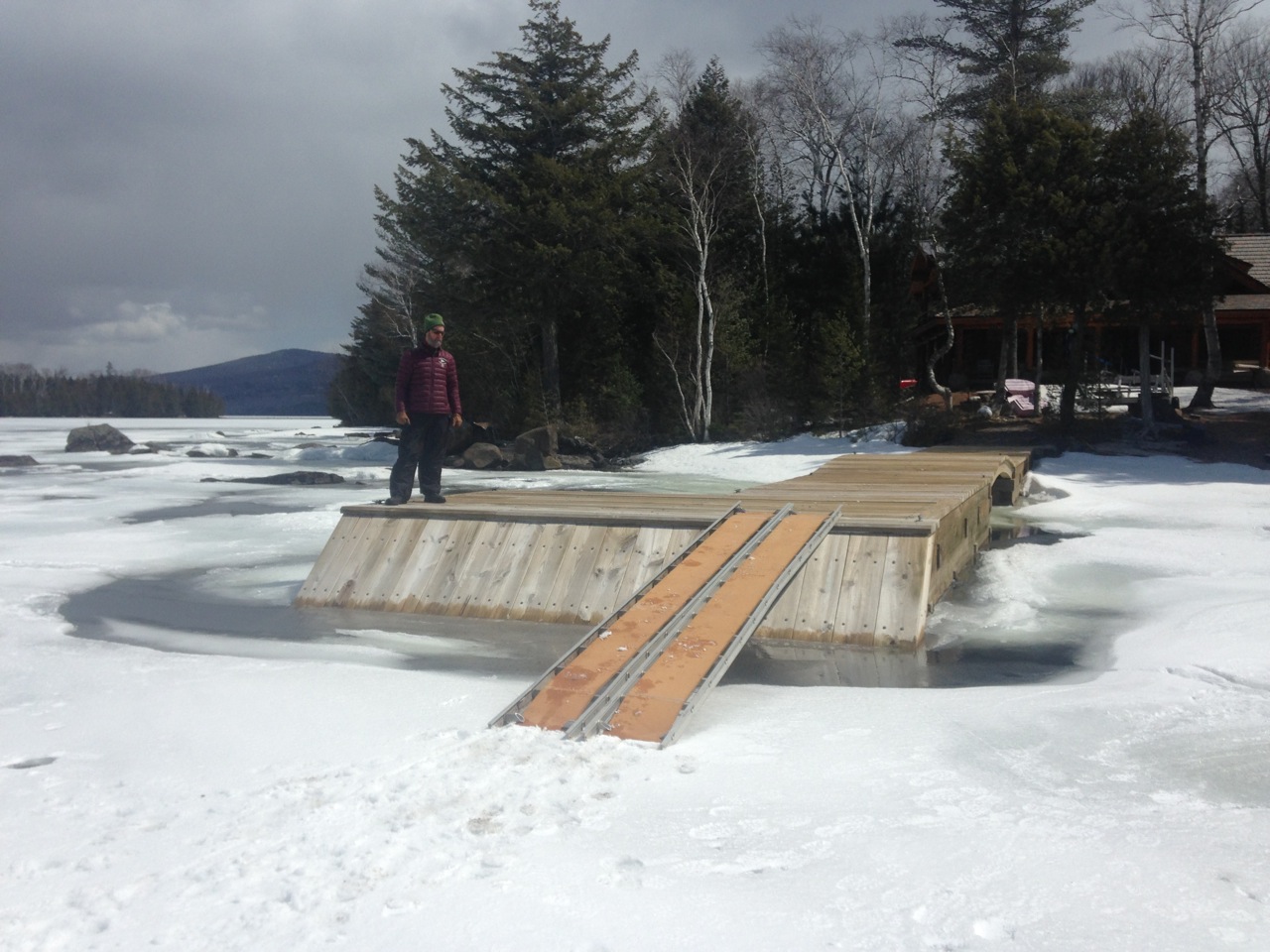 The ladder ramps had their first real job today and worked splendidly. Boats and men rolled up and down with ease. Even though the crust was hard from the shore, there were a few holes to watch for. The dock made it very easy.