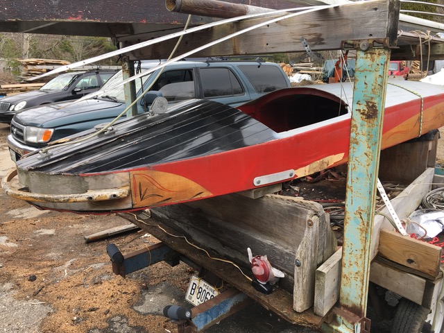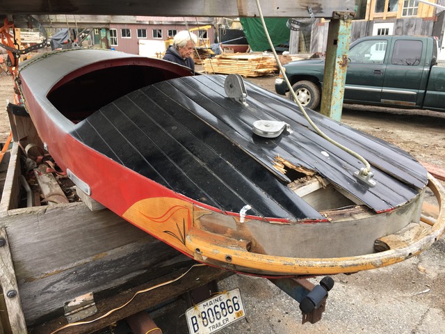 The post was bounced around all over New England before landing in Rob’s lap, and he didn’t hesitate. A few days later this package arrived at a friend’s sawmill. Some of it will wind up in the sawdust pile, but there is a wonderful boat in there. It’s essentially a two person Renegade with a custom stern. She has the Renegade steering system, right down to the marginal hand steering, and it’s built offset to the port side. Rob says that works for him as he’s left-handed. Didn’t quite know how to respond to that so let it go.