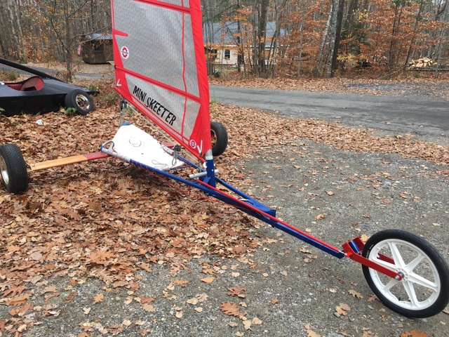 We had a number of converted Lockley Skimmers at the September regatta. By the end of the weekend it appeared that there was room for some performance improvement. With that in mind, we took one and converted it into an approximation of a Mini Skeeter. As landsailors this class has done very well. This Lockley shares the footprint and rig, and weighs 20# less. There is an aerodynamic loss, but that might be resolved later. For now, it looks very optimistic.