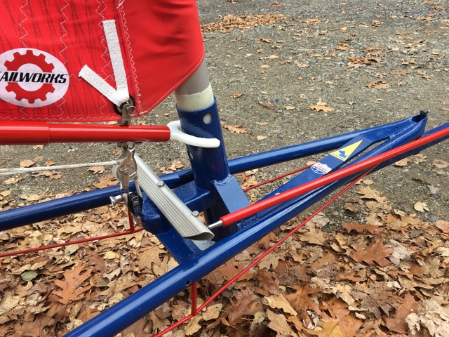 The major change to the Lockly is to a free standing mast. This requires a pipe socket mast step and some welded supports. This particular boat already had the flat bar added from the stem to the old mast step so it made an ideal base upon which to build the new mast step. The double rod steering has been replaced with a single arm, like a DN. It runs from a ladder rung steering bar set just above the old mast step. This allows you to push hard against it with your feet while gently feathering the steering bar, as well as lowering your body by bringing your feet forward. There will be a heel plate coming soon. Having your feet and legs all inboard adds to security and aerodynamics, and, should you want a body it can easily fasten to the outside of the main rails.