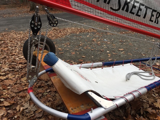 The sheeting out back is fairly conventional. There’s plenty of room to duck under the boom, but it is low enough to keep the slot to a minimum. It might not be clear from the previous photo but there is a 2:1 downhaul there. One of the secrets to the Mini Skeeter rig is because the sheet hauls from the middle of the boom the whole sail is pulled down and therefore wonderfully flattened. The 2:1 at the gooseneck helps simulate this.