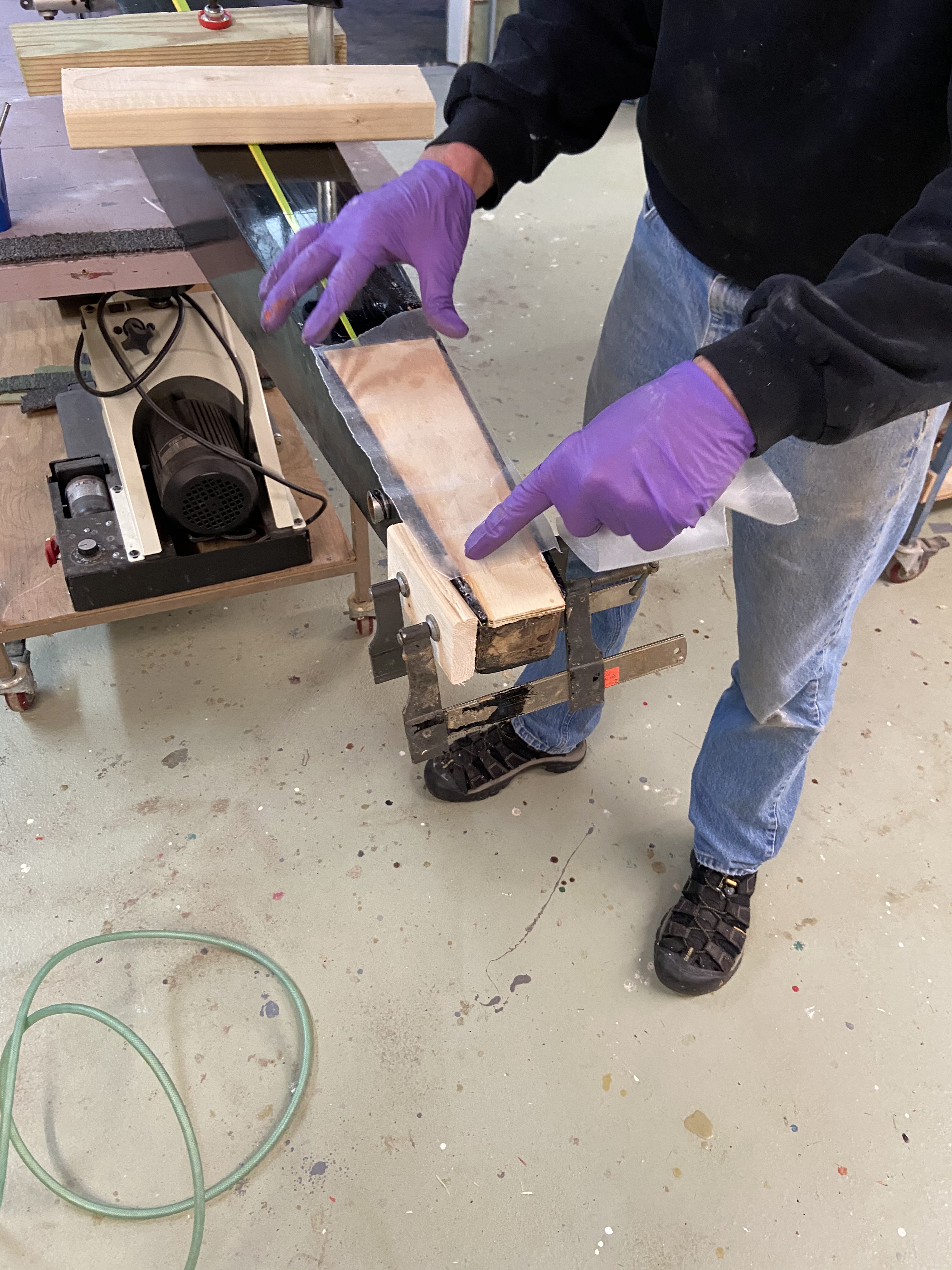 So we did not waste too much time and got to work on the DN. I started poking with an ice pick and found that indeed the stem area had some issues. I routed about 5/16 of an inch of the port side panel a foot back from the nose, leaving the top and bottom deck in tact for reference. We cut out about a 4 inch by inch and a half of the punky port side panel, exposing the bushing tube. We found that the stem blocking did not extend as far back as the steering chock bushing tube. The tube was still in place and attached to the top and bottom of the stem, so I cut a 3/4 inch piece of plywood to fit the cutout area, and a 1/4 inch piece to fit the area of the side panel that I had routed 5/16 from. We then mixed some epoxy, I gave Jack several ounces and while he wet out the routed area and the plywood pieces I thickened the remainder with West 404 High-Density filler to as thick as I could mix. I surrounded the bushing post with the mixture and then bedded the plywood pieces in it. Using wax paper and a good flat piece of 2/4 clamped that and also clamped a few inch piece of the top deck that had also delaminated. There was also a bit of plywood separation from the side panel that we sanded and epoxied also.