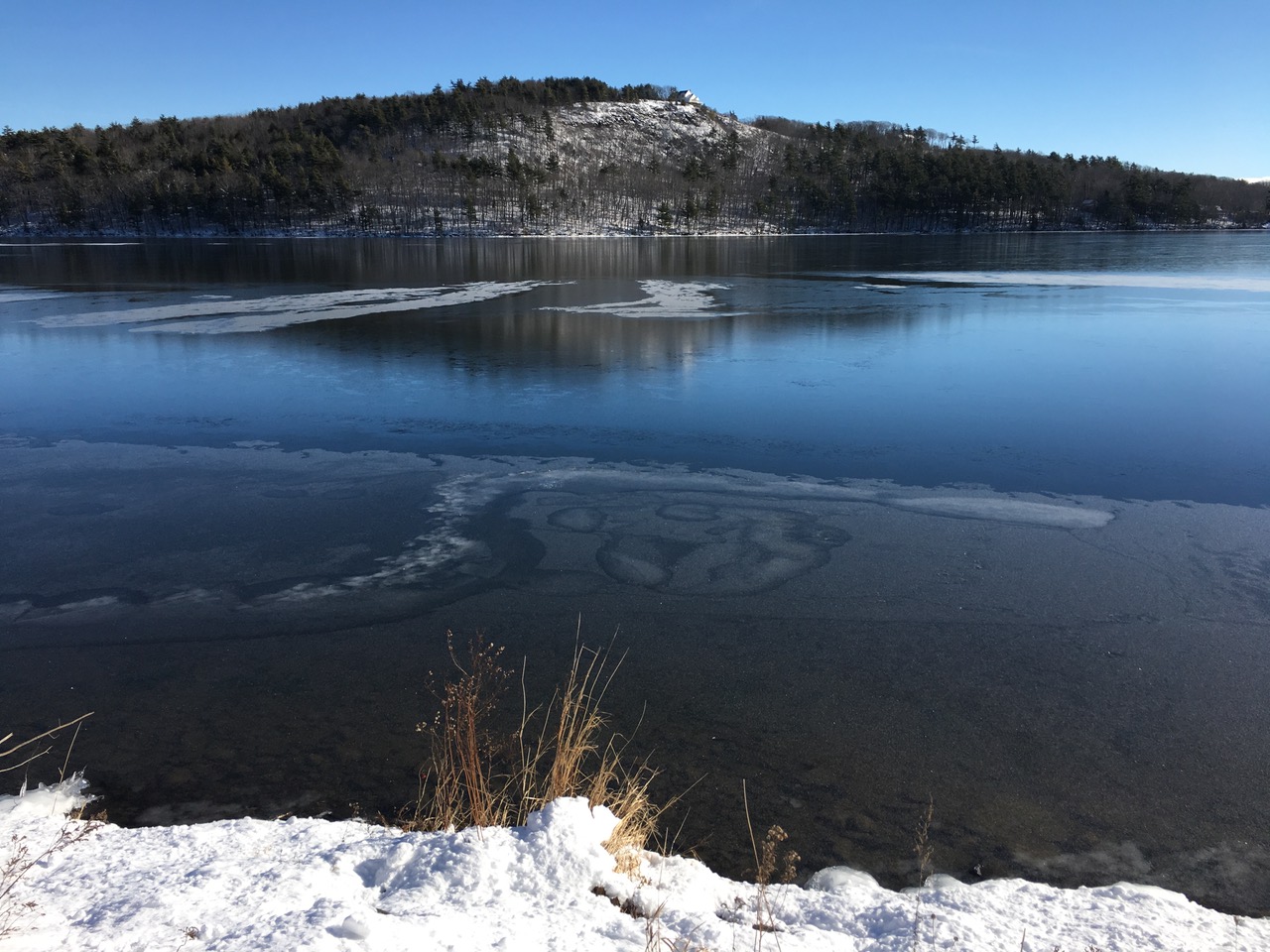 But Dolby Pond, also known by the wonderful name of Dolby Flow, has four inches of ice as measured today. The northern part is older grey ice and the southern part is all think, hard and black. Sadly for sailors there is minimal wind until the weather moves through, at which point the plate will change. Also, it’s in Millinocket. Not that far, and very skateable. Thanks to Bob Lombardo for the tip.