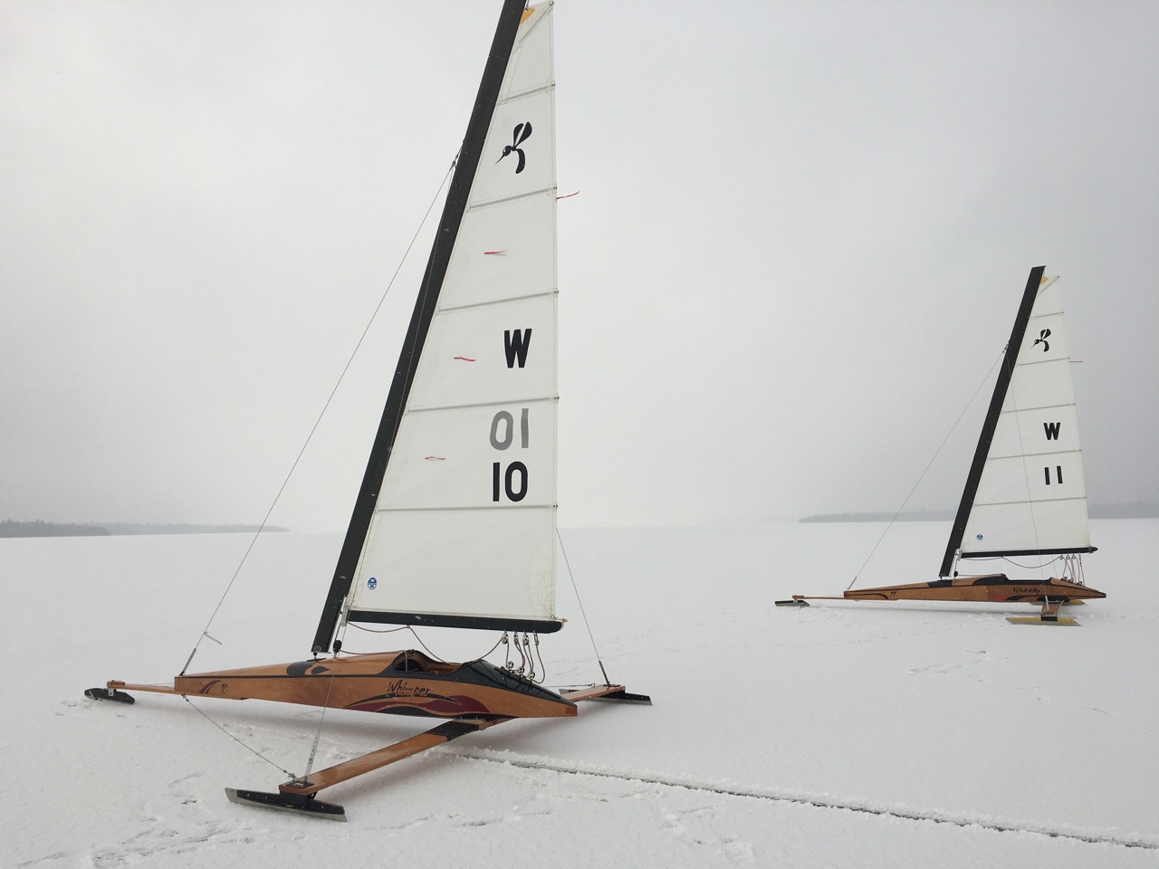 Lac St-Francois in Lambton was just amazing today. Under the 1/2 snow cover, we have a grade 9 ice and even grade 10 in some areas. We scouted the ice and found 4-5 inches. Some darker spots in the snow were a bit thinner but nothing to be afraid of. And it was easy to sail around those darker areas. Wind was steady and perfect for the full Whizz rig.