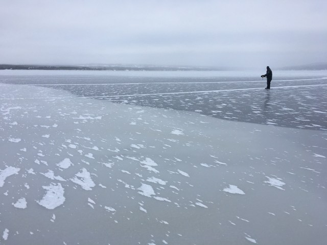 “We have a nice plate of grey ice here in Lambton. 3” thick with some darker areas which are also 3” thick. There is a large area with open water, but easy to see and to avoid. The problem is to access this ice. There is slush under the snow, too thick to even try to sail through it. So we can’t get out of the bay. We tried to find another launch site nearby, but there is slush everywhere. So we decided to remove the slush/snow with a snow blower, and make a path to the ice. We hope it will freeze hard overnight, even though there is water coming on the surface by a small hole in the ice. Wind forecast is poor for tomorrow, a bit better for Sunday, and good for Monday. So we have some time this weekend to work on our «winter road» !! And the ice will get thicker too!”