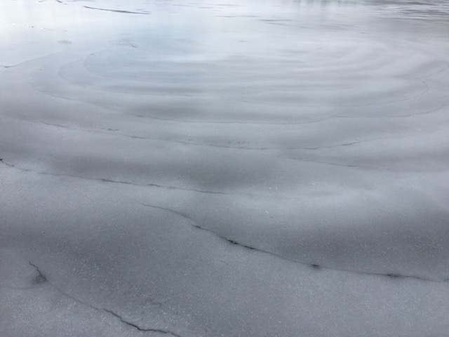The plate looks great. There is a thin film of water skimmed with ice. You’ll probably bump over our footprints tomorrow. It is four inches everywhere; very little variation. Ice is hard and will give us a 7ish surface. There is one open crack crossing the lake, and we found two drainholes that could eat a runner, but just barely. There might be others.