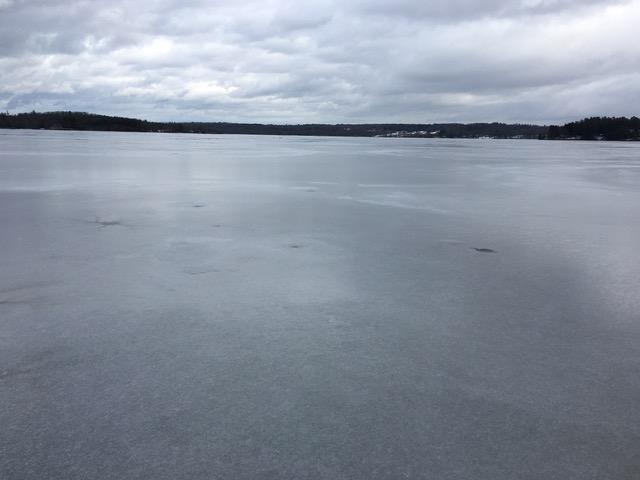 The plate looks great. There is a thin film of water skimmed with ice. You’ll probably bump over our footprints tomorrow. It is four inches everywhere; very little variation. Ice is hard and will give us a 7ish surface. There is one open crack crossing the lake, and we found two drainholes that could eat a runner, but just barely. There might be others.