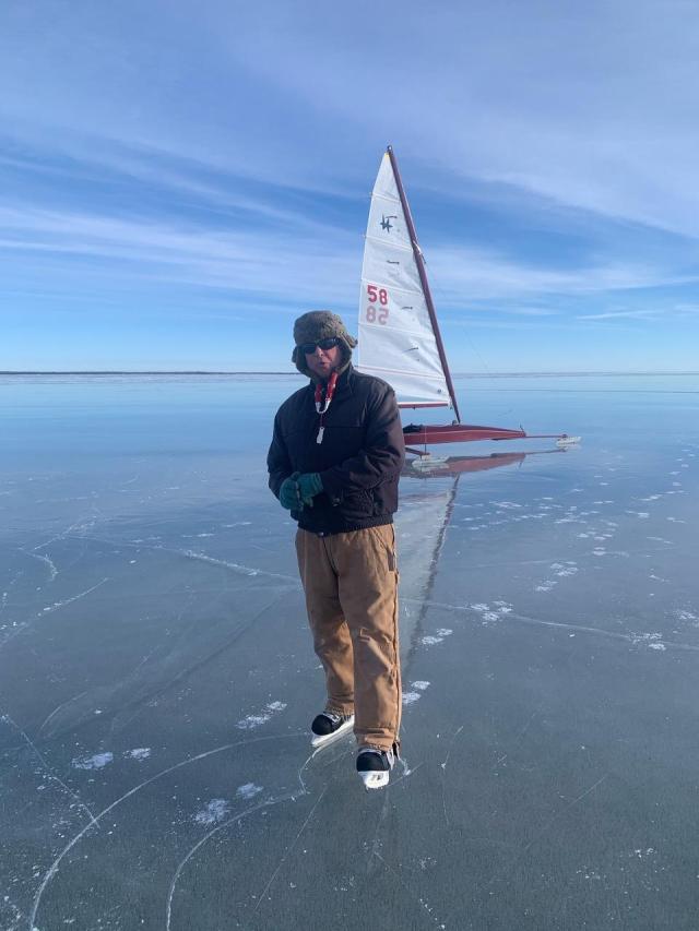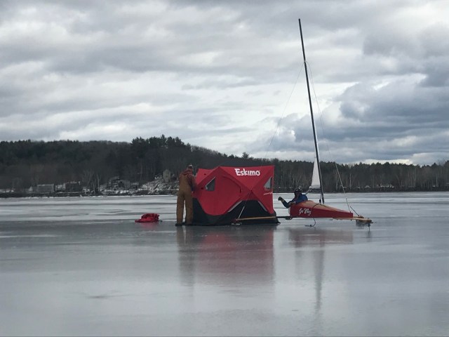 Last month at Sabattus the day started off with light air. The ice fishermen didn’t feel the need to tie down their tent, and all was fine until the wind began to build. As we were leaving the pits after lunch Jim Gagnon noticed the Red Eskimo doing what Eskimos do, running across the ice downwind. He managed to outrace it before it made the far shore and get his plank around behind it. Boat and tent coasted to a quiet stop.